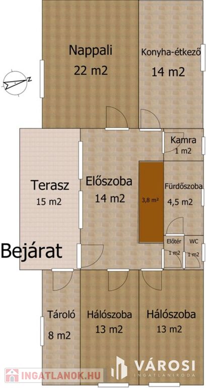 A szobákban parketta, az előszobában, a konyhában és a fürdőszobákban járólap van. A melegvizet két külön villanybojler biztosítja.