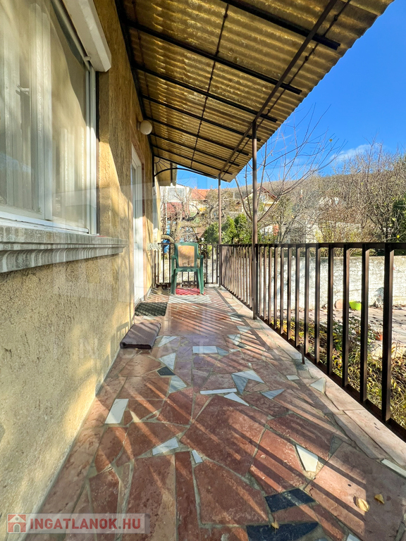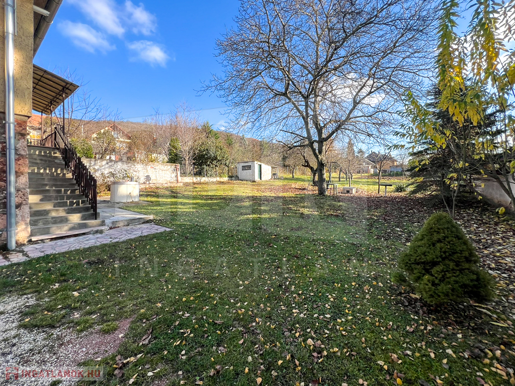 A HÁZ kétszintes kialakítású, jellegzetes, masszív szerkezetű, magasföldszintes épület, amely a korszakra jellemző (1960-as évek) arányokkal és nagy ablakfelületekkel rendelkezik. A ház külső karakterét a természetes kőburkolatú lábazat határozza meg, amely jól illeszkedik a környező hegyvidéki, falusias környezethez. A földszinten találhatóak a KISZOLGÁLÓ HELYISÉGEK (garázs és tároló), a felső szinten pedig a LAKÓTÉR, amelyhez két külső lépcső is felvezet (egyik közvetlenül a fedett teraszra érkezik), így a lakószint két külön bejárattal is megközelíthető. A felső szint meghatározó eleme a tágas, világos konyha, amely egybenyílik az étkezőként is funkcionáló nappali helyiséggel. Innen lehet kilépni a kert és a hegyek irányába néző TERASZRA. A lakószinten további két, nagy méretű, jól berendezhető, hangulatos szoba található.