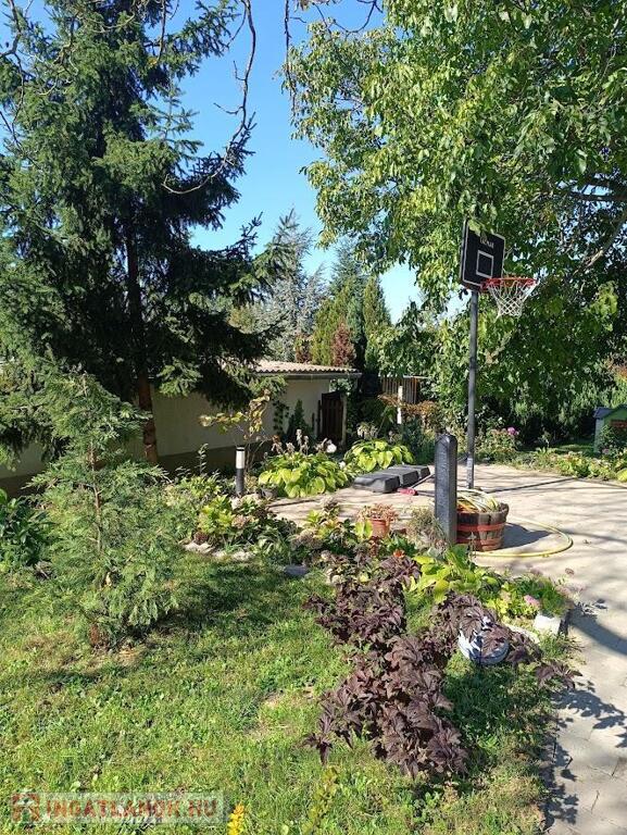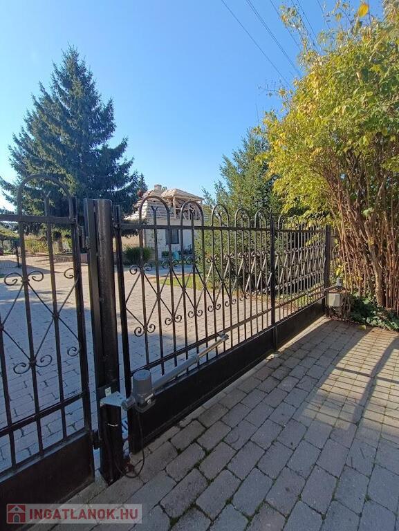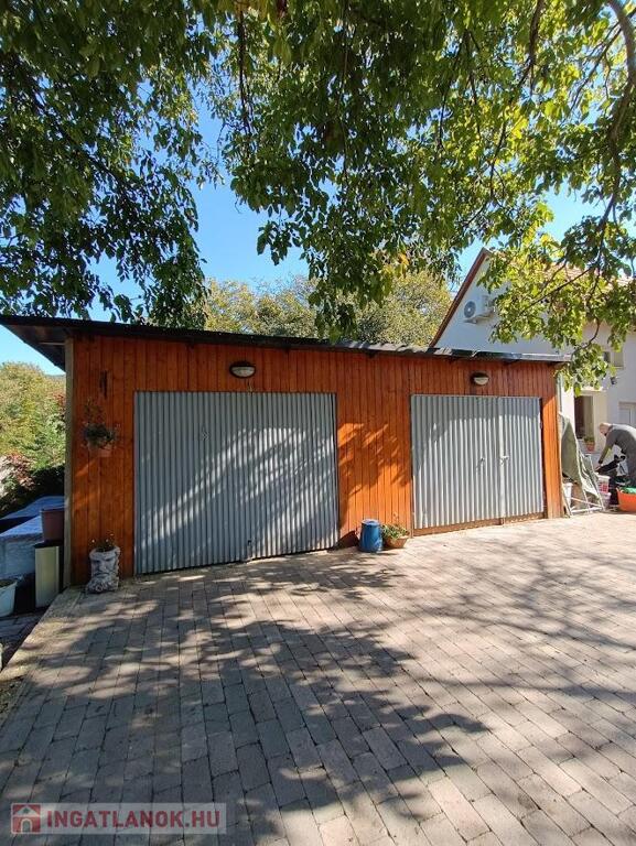 A 1000 m²-es, rendezett telek térkövezett, a bejáratnál elektromos kapu nyílik, és egy dupla beállásos, könnyűszerkezetes garázs is helyet kapott.