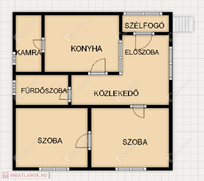 Elosztás: két szoba, konyha, kamra, közlekedő, előszoba, fürdőszoba
