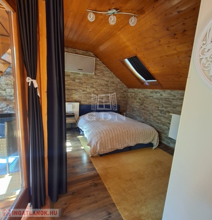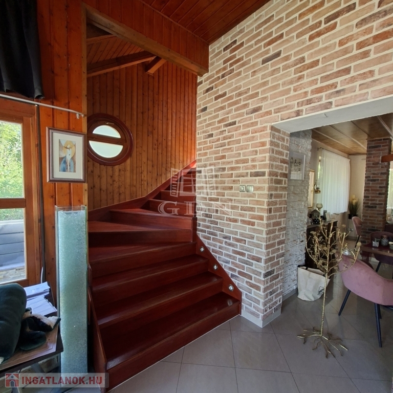 És maga az épület....., a földszinten, ami 84 m2 egy tágas nappali, aminek az udvar felé teljesen üvegezett az oldala, egy nagy étkező, konyha, fürdő és egy tároló található (amit a jelenlegi tulajdonosok vendégszobaként hasznosítanak), a bejárat felől pedig egy fa szerkezetű teraszt alakítottak ki. A tetőtérben, aminek hasznos alapterülete 36 m2, található egy illemhelyiség, fürdő, hálószoba és egy nappali szoba, innen is egy fedett erkélyre jutunk.