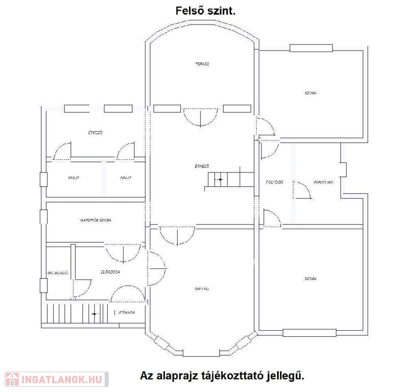 Emelet: világos nappali, 3 háló, különálló konyha, étkező, 2 fürdő, vendég-wc, terasz.