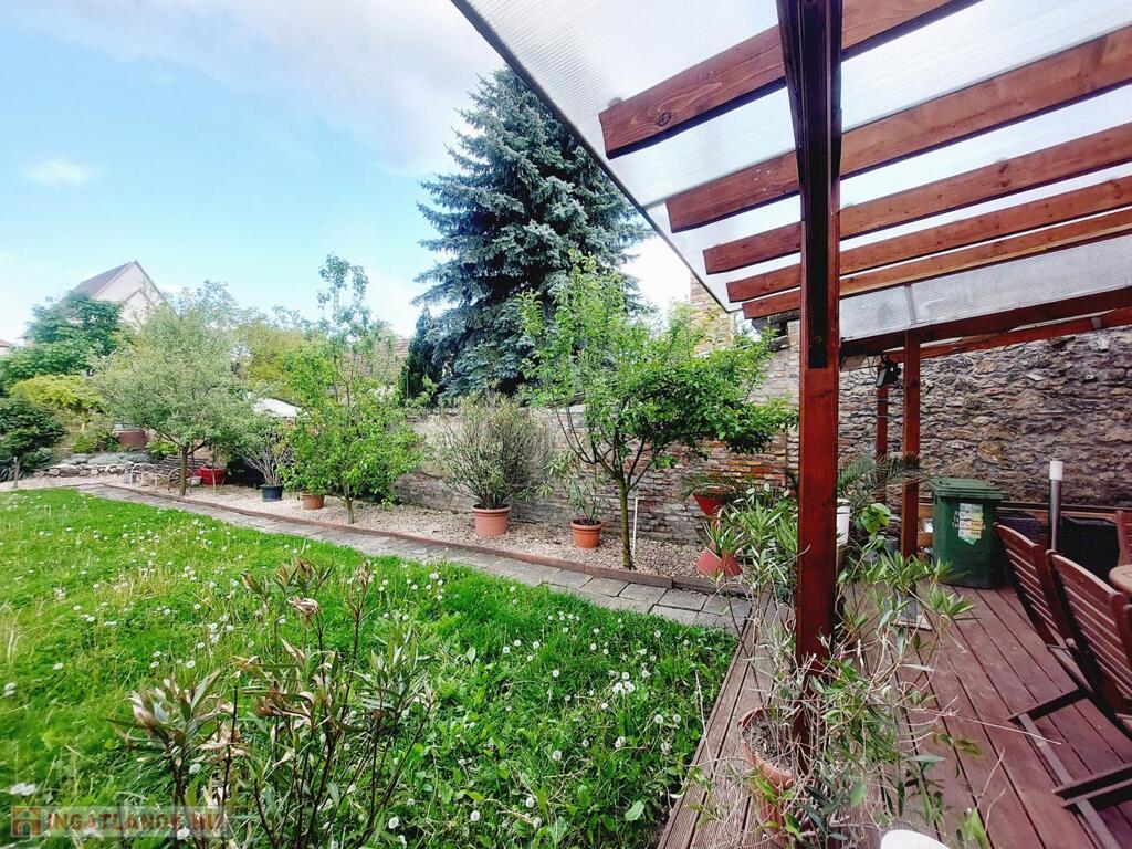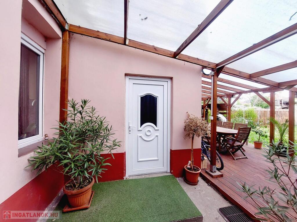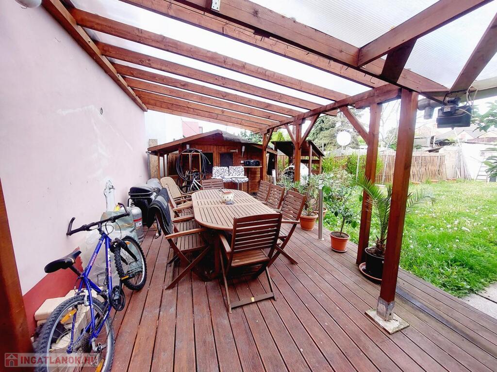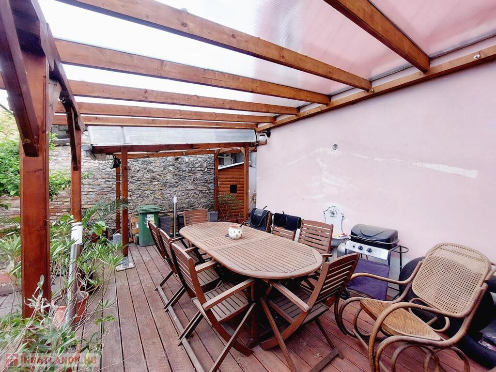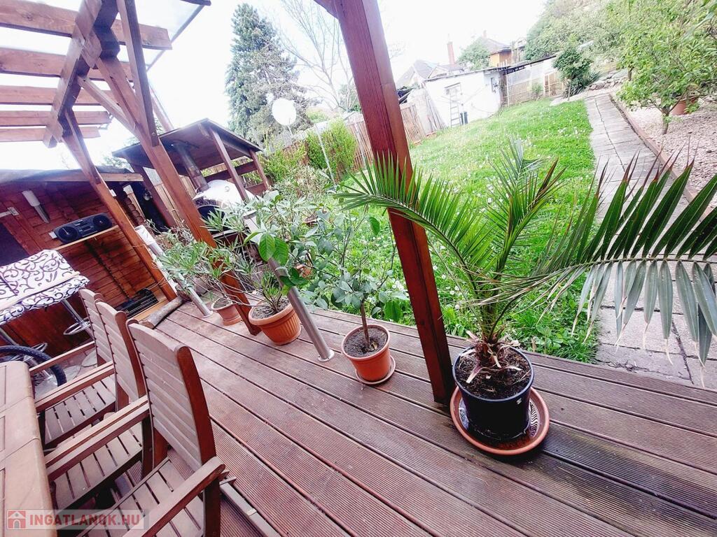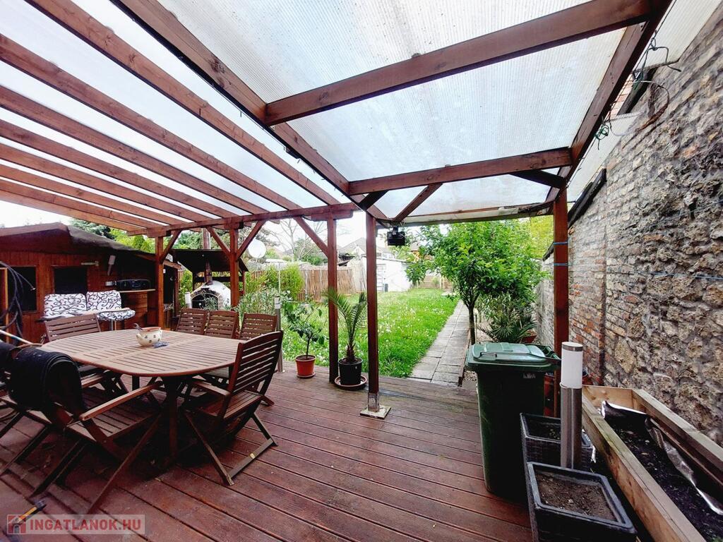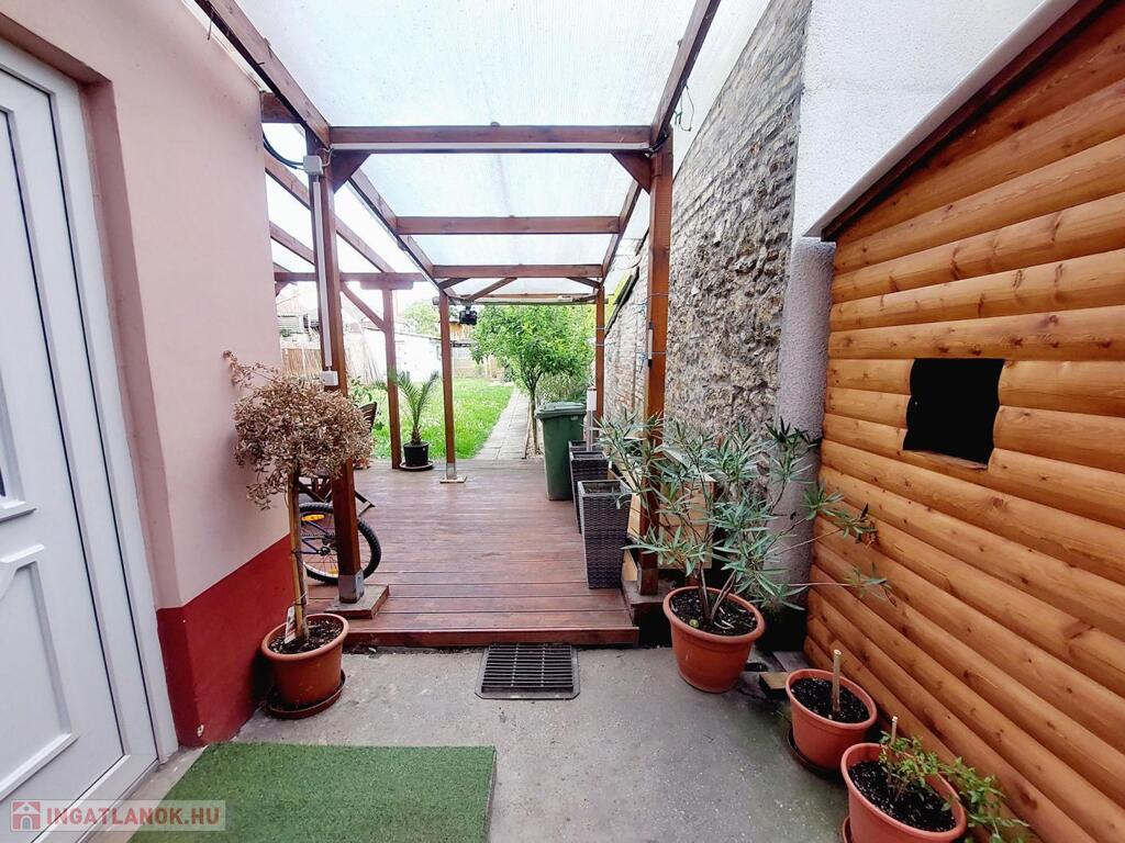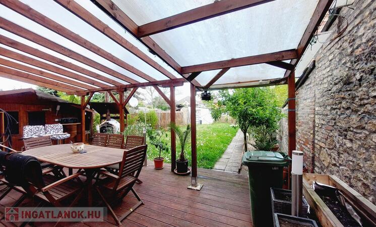 2020-ban került kialakításra a fedett terasz, mely igazán különleges, mediterrán hangulatot kölcsönöz. Kellemes programot biztosít egy kis búbos kemence is, barátok, családtagok biztosan csodájára járnának a benne készíthető finomságoknak. A kert egy része füvesített, 2 oldalt gyümölcsfák és veteményes díszíti, a telek lekerített végében melléképületek, pince található.