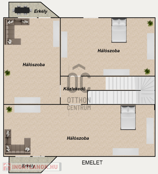 A földszinten egy tágas amerikai konyhás nappali adja az otthon központját, ahonnan közvetlen kijárat nyílik a fedett teraszra – ideális helyszín családi reggelikhez vagy esti kikapcsolódáshoz. Emellett fürdőszoba WC-vel, tároló és előszoba is helyet kapott. Az emeleten három külön nyíló szoba biztosítja a privát szférát, míg két szobából erkély is elérhető, ami tovább növeli a térérzetet és a komfortot.