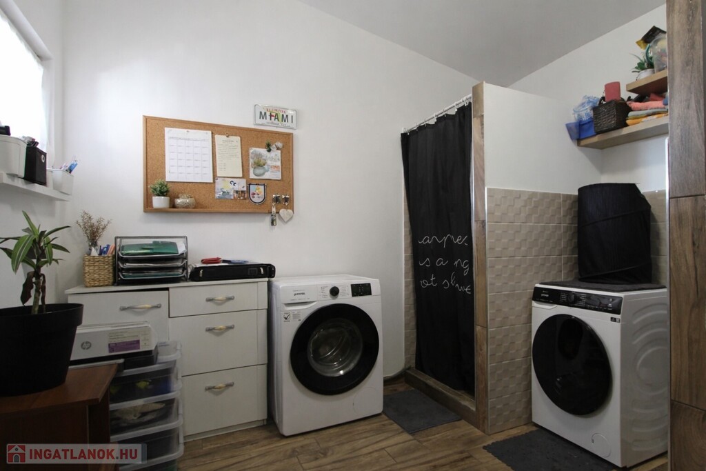 Második bejárata a tetővel ellátott, jól szeparált udvari teraszról nyílik ahol közvetlenül egy mosókonyha került kialakításra. A mosókonyhából pedig egy közlekedőn keresztül azonnal a ház központjába jutunk.