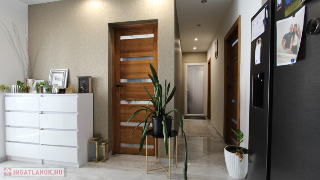 Kellemes, igényes kialakítású újszerű épület, közel 50 nm-es központi közösségi térrel rendelkezik, mely a hangulatos kialakítású főbejáraton a tágas előszobával egylégtérben található.