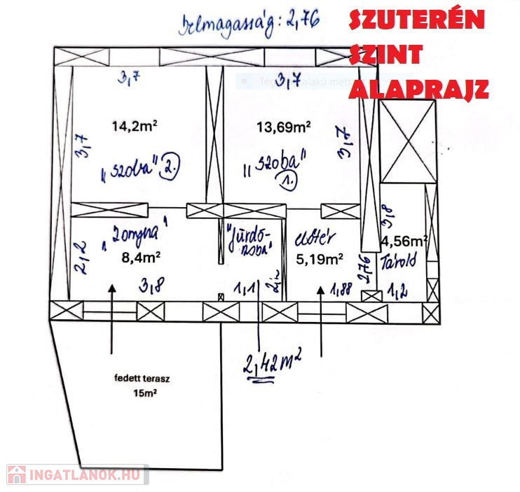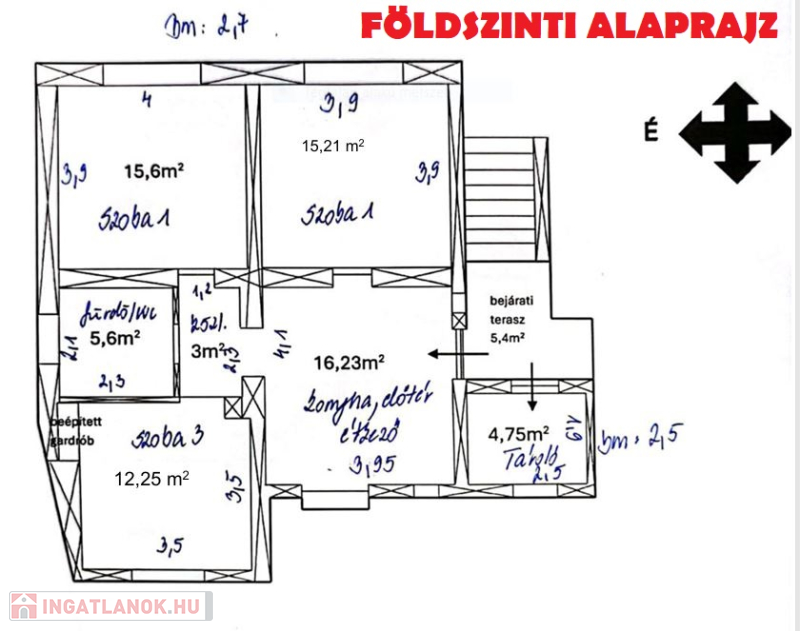 A telek enyhén lejtő. Az ablakos szuterén szint, melynek belmagassága 2,76 m, már felújításra előkészített. A földszinten 3 hálószoba, egy tágas konyha-étkező, fürdőszoba és egy tárolóhelyiség áll rendelkezésre.