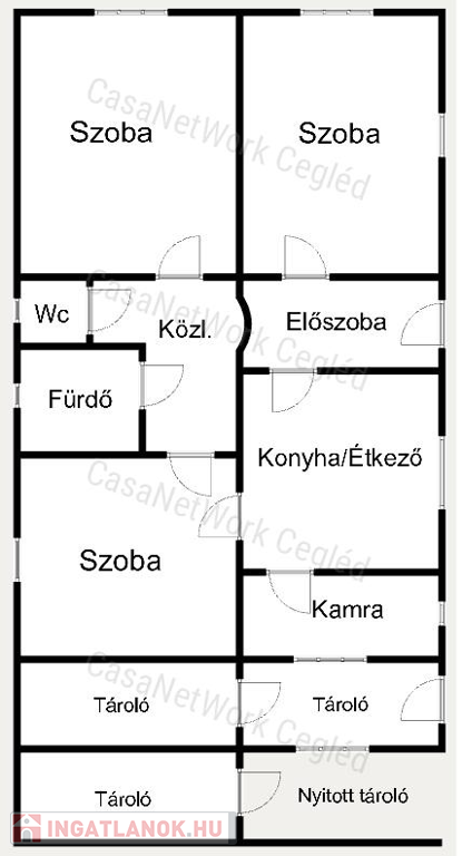 - Helyiségek elosztása: 3 külön nyíló szoba, külön fürdő-wc, konyha, kamra, előszoba, közlekedő