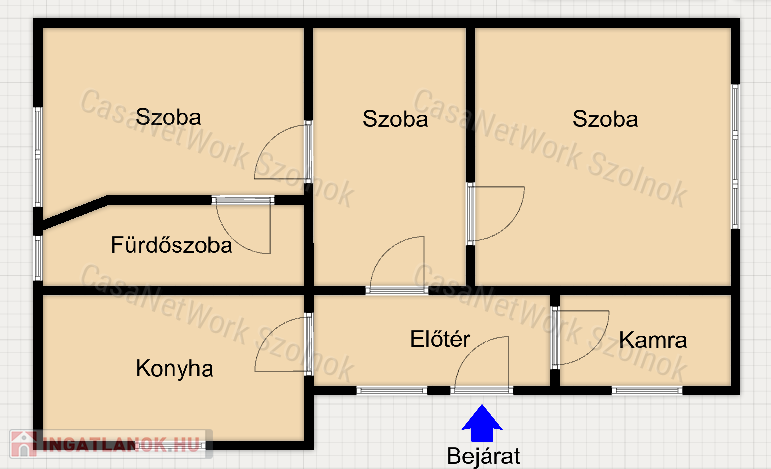- a nettó lakótér 60 m2, amelyben a következő helyiségek kerültek kialakításra: előtér, konyha, fürdőszoba+illemhely, kamra, és 3 szoba