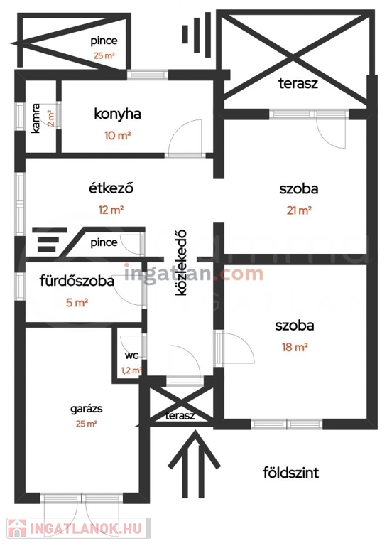 A házhoz egy 25 m²-es garázs és egy 12 m²-es kamra is tartozik.