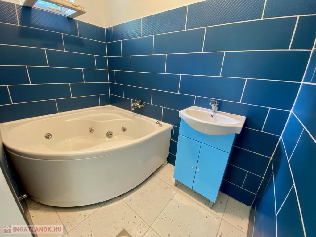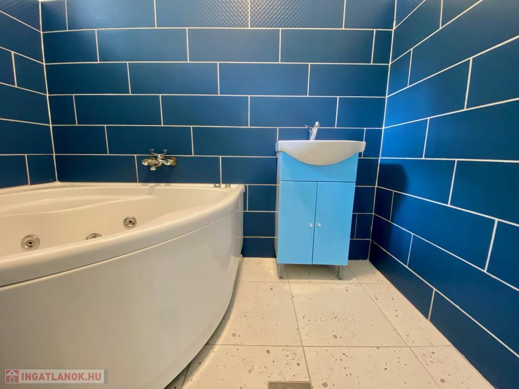 A fürdőszoba sarokkáddal, külön nyíló WC-vel, szellőztethető ablakkal rendelkezik.