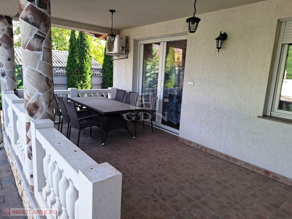 Az ingatlan egyedi stílusa rögtön szembeötlő: a műkő korlátokkal díszített, teraszok elegáns hangulatot árasztanak, és a konyhából közvetlenül megközelíthető intim fedett terasz tökéletes helyszín egy nyugodt reggeli kávéhoz, vagy egy hosszú, beszélgetős estéhez.
