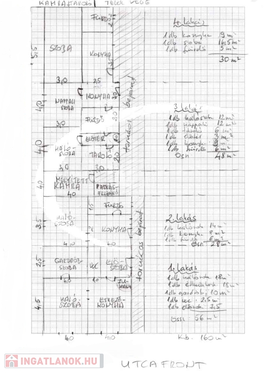nappali 12m2, lakás szoba 12m2, tároló 6m2, konyha 9m2, előtér 3m2, fürdő-wc 6m2;
