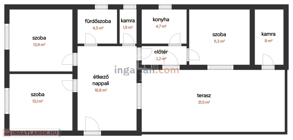 A családi ház az alábbi helyiségekből áll: nappali/étkező 16,8 nm, szoba 13,1 nm, szoba 13,9 nm, szoba 11,3 nm, konyha 4,7 nm, fürdőszoba 4,5 nm, kamra 1,9 nm, előtér 3,2 nm, kamra 8 nm, fedett terasz 31,5 nm.