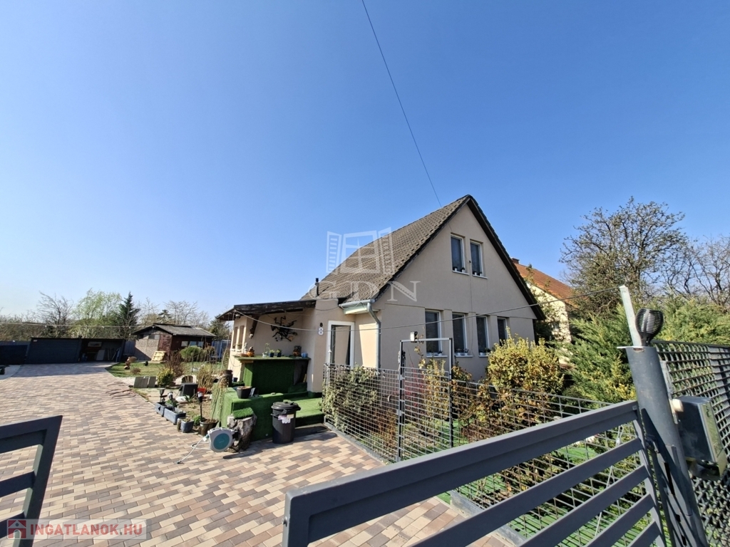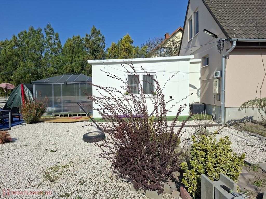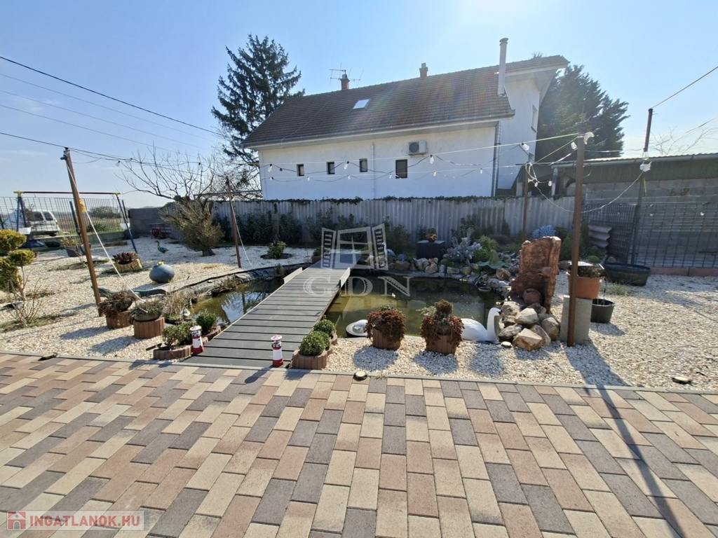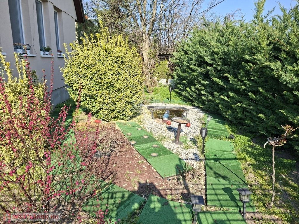 3 garázs, kb 75 nm, kerti tó, viacolorozott kert vezet a garázshoz.