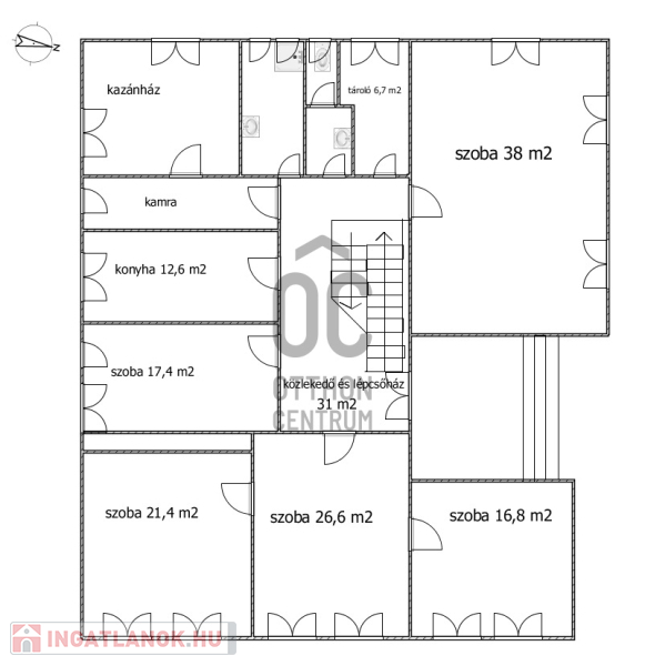 - Tágas közlekedő és lépcsőház, ahonnan a szobák nyílnak,
