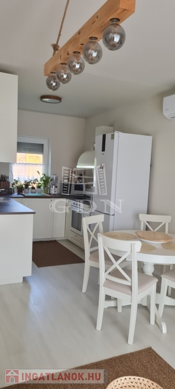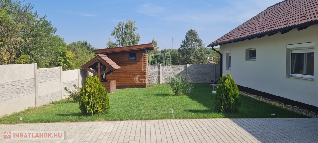 Eladó egy újszerű állapotban lévő, 138 m²-es családi ház, amely jogilag családi ház, de kialakításában inkább egy ikerház jellegű ingatlan – az épületek csak a fedett kocsibeállónál érnek össze.