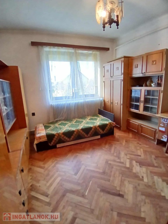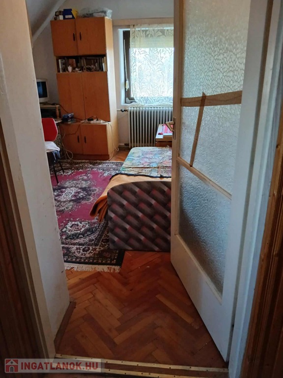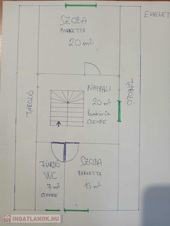 Emelet: (60m2) 2 szoba (parkettás), nappali, fürdőszoba WC-vel, két oldalt tároló.