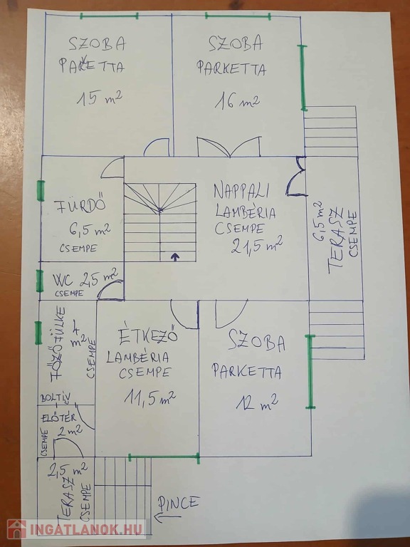 Földszint: (100m2) 3 külön nyíló szoba (parkettás), tágas nappali, konyha + főzőfülke, fürdőszoba (150 literes bojlerrel), külön WC, előtér, pincelejáró. Egyik szobában WiFi-s klíma is található.