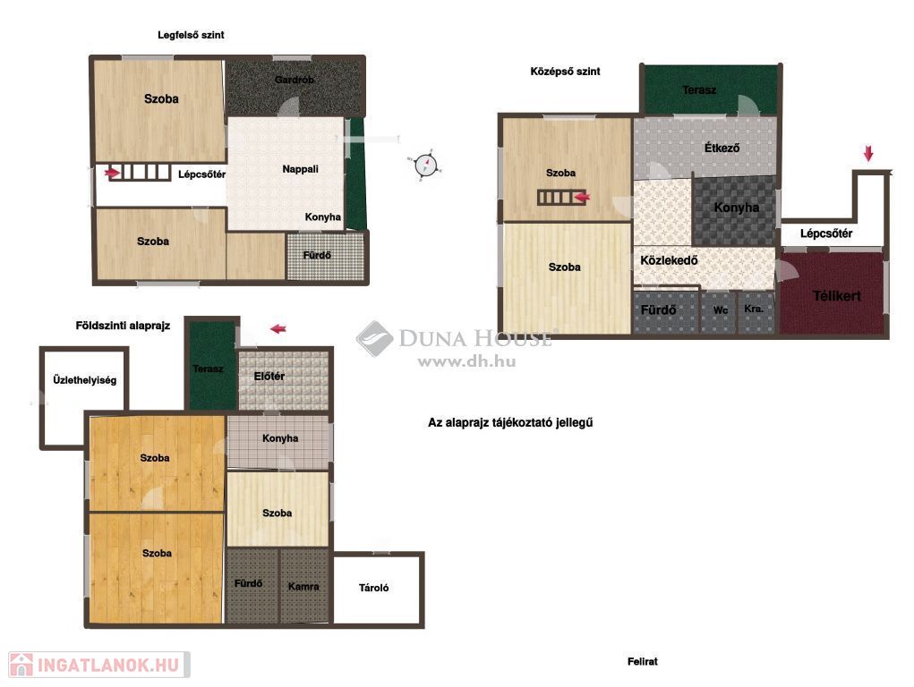A ház déli fekvésű, praktikus elrendezésű, a földszint 96 négyzetméter lakóterületű, az emeleti 2 szint 168 négyzetméter lakóterületű, + 14 négyzetméter terasz.