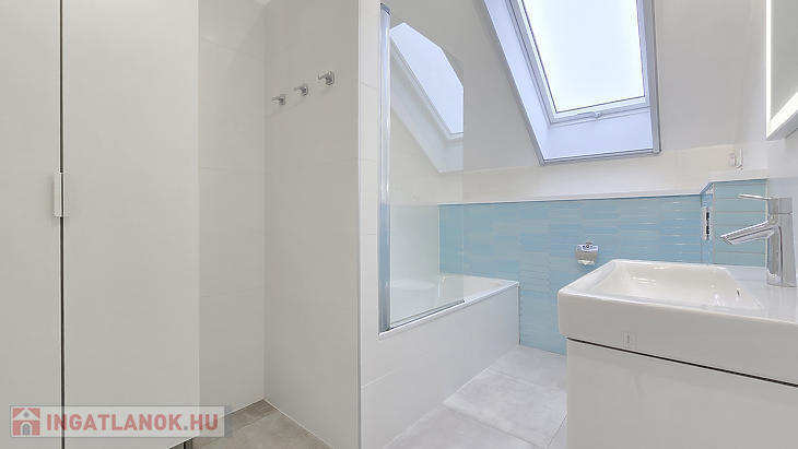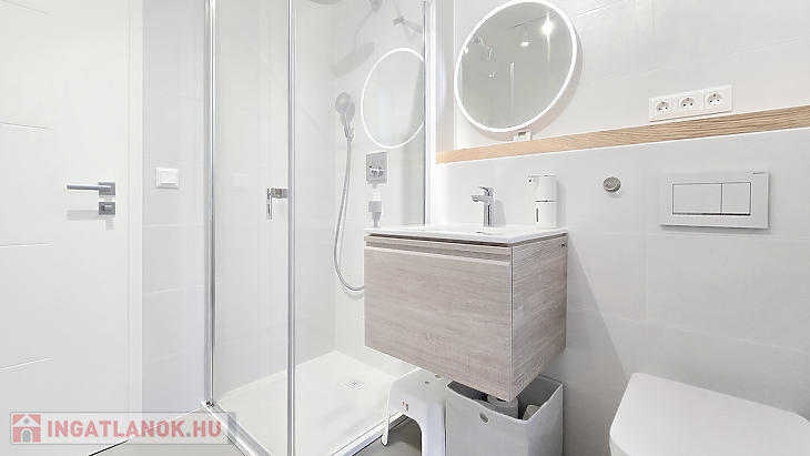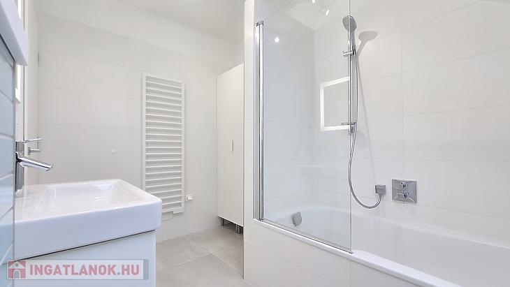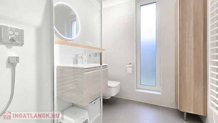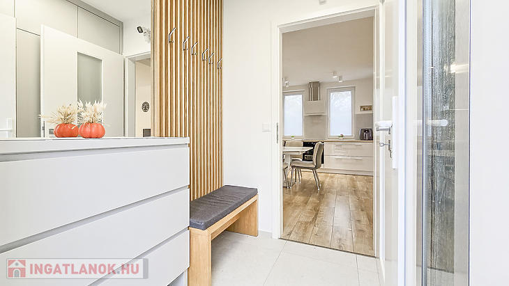 A helyiségekben prémium minőségű laminált padló, vizes helyeken hidegburkolat található.