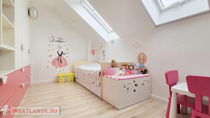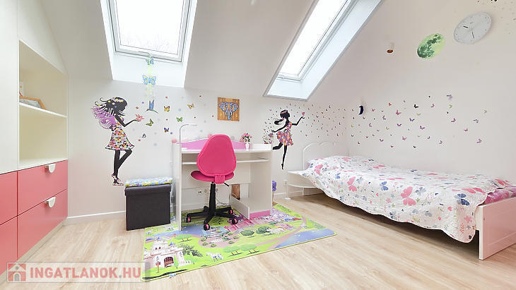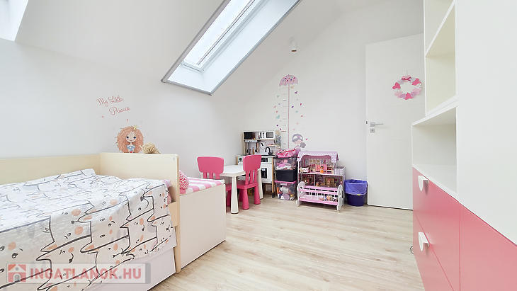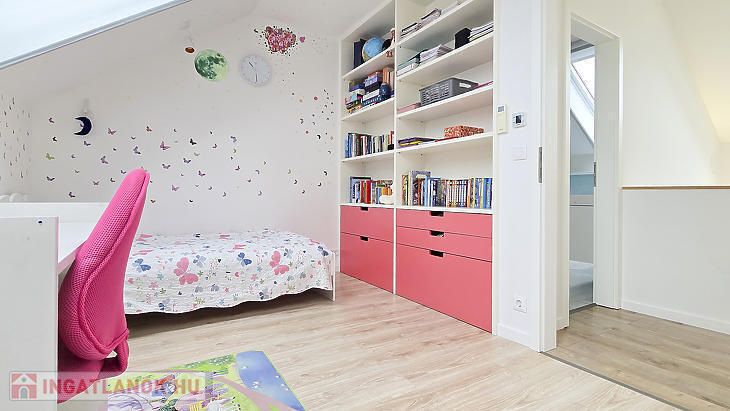 A kétszintes, beépített tetőteres ingatlan jól átgondolt elrendezésével és kimagasló felszereltségével ideális választás akár többgyermekes család számára is.