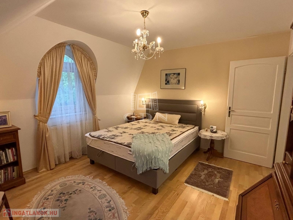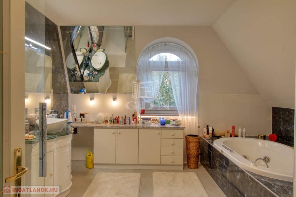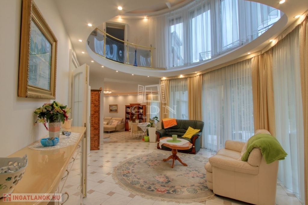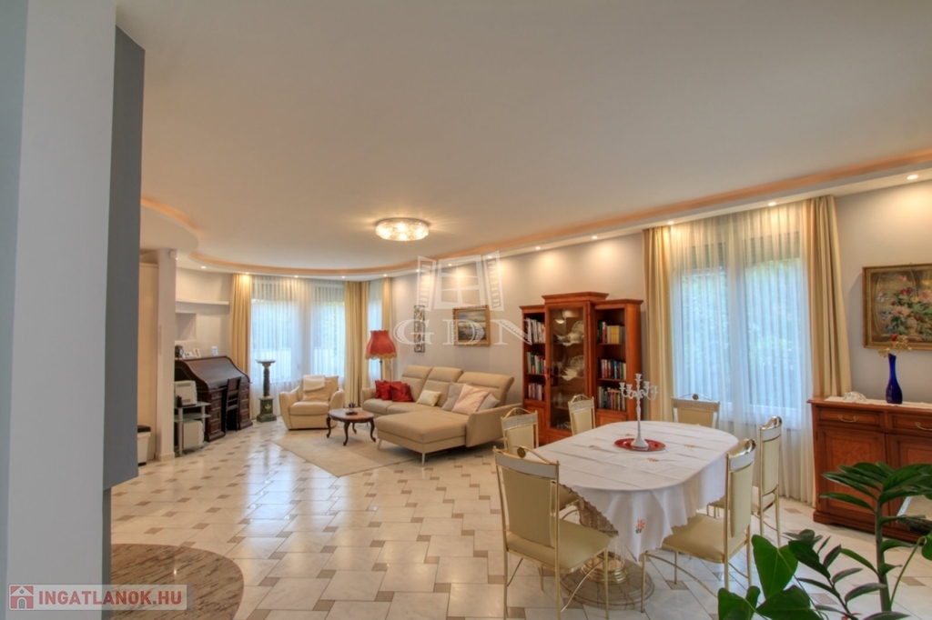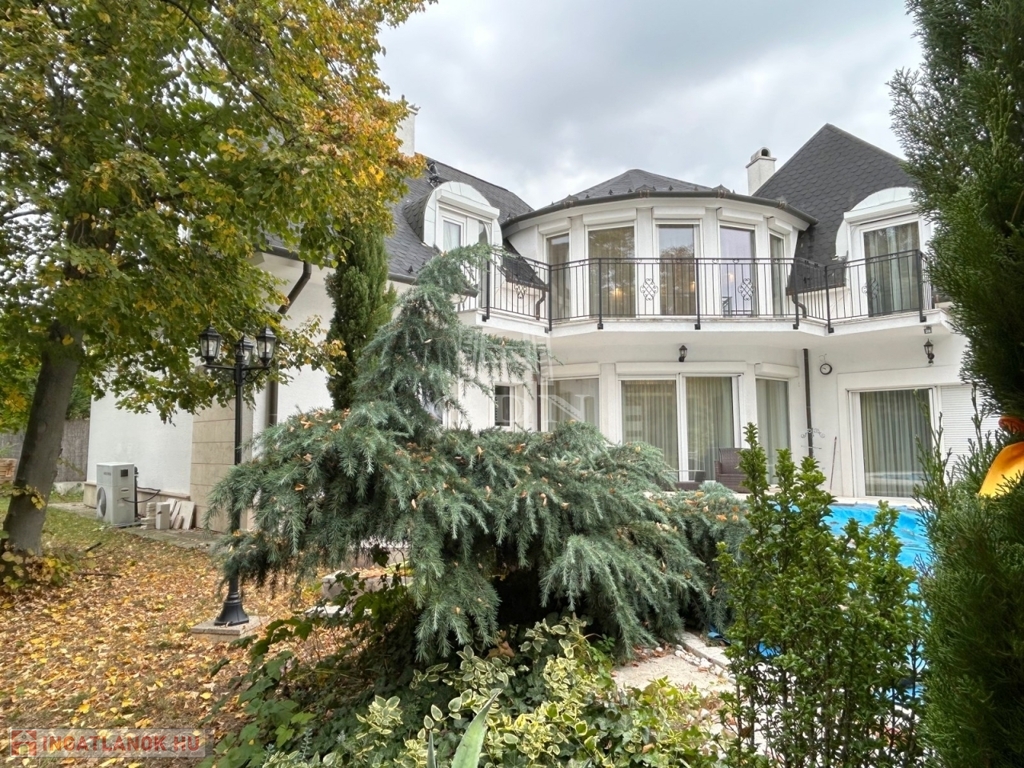 4882. Törökbálint legszebb kertvárosi övezetében a Tükörhegyen, kétlakásos, impozáns enteriőrrel rendelkező, galériás, kiváló állapotú, 7 szobás, riasztóval szerelt, délnyugati fekvésű családi ház garázzsal, hőszivattyús fűtött medencével, parkosított 871 m2-es telken eladó.
