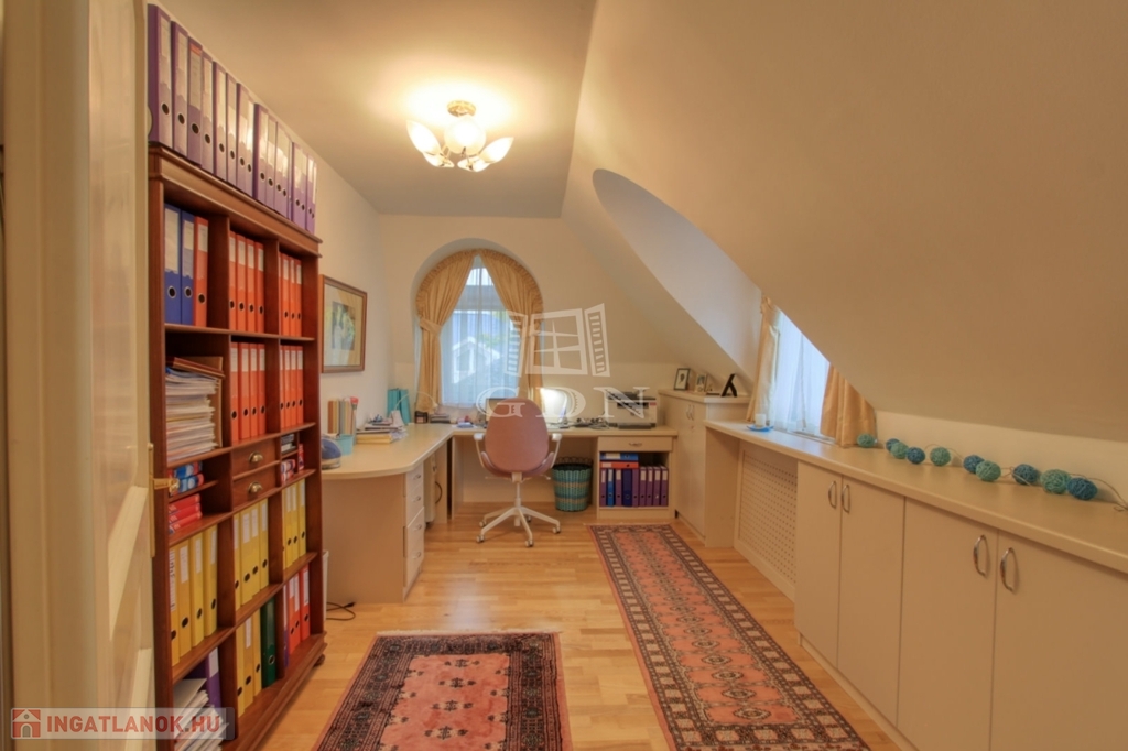 Az emeleti szinten a kör alakú galéria térből juthatunk egy 15 m2-es gardrób szobán keresztül 2 db hálószoba felé (ahol az egyik hálószobához erkély kapcsolat és zuhanyzós fürdőszoba tartozik), illetve a fő hálószoba és dolgozószoba irányába. A fő hálószobából tágas, walk-in zuhanyzóval, pezsgőfürdős káddal rendelkező fürdőszoba nyílik.