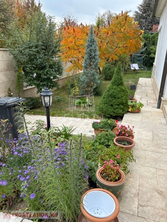 A gondosan megtervezett, ápolt kertet szép növényzet díszíti, a kerti szerszámok tárolására egy kis faház biztosít helyet.