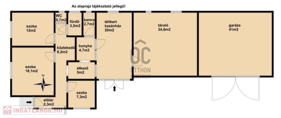 Az ingatlan jelenlegi helyiségei: előtér, közlekedő, 3 szoba, konyha, étkező, kamra, fürdőszoba, wc, télikert, ahol a központi fűtést üzemeltető fa tüzelésű kazán is helyet kapott, egy nagyobb méretű tároló és egy garázs.