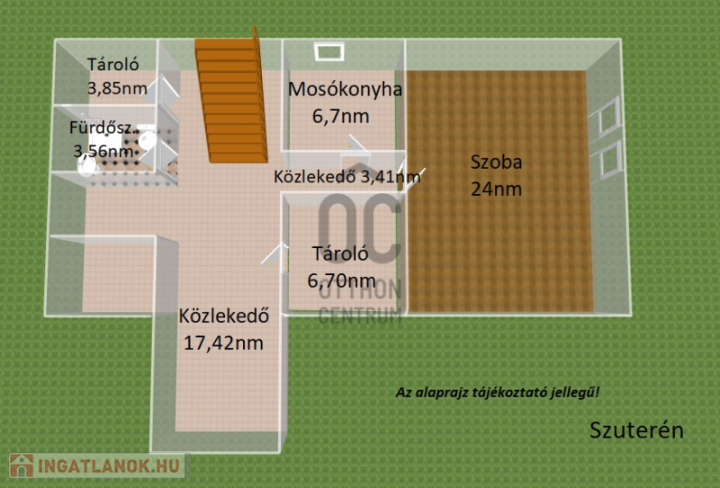Szélfogón át juthatunk be az előszobába, ahonnan nyílik egy vendég-wc, a gépészeti helyiség, a garázs, a szuterénbe is innen juthatunk le, valamint a nappalihoz-konyhához is beléphetünk. A szuterénben egy fürdőszoba, egy szoba, 2tároló és egy mosókonyha is helyet kapott, radiátorok gondoskodnak a melegről.