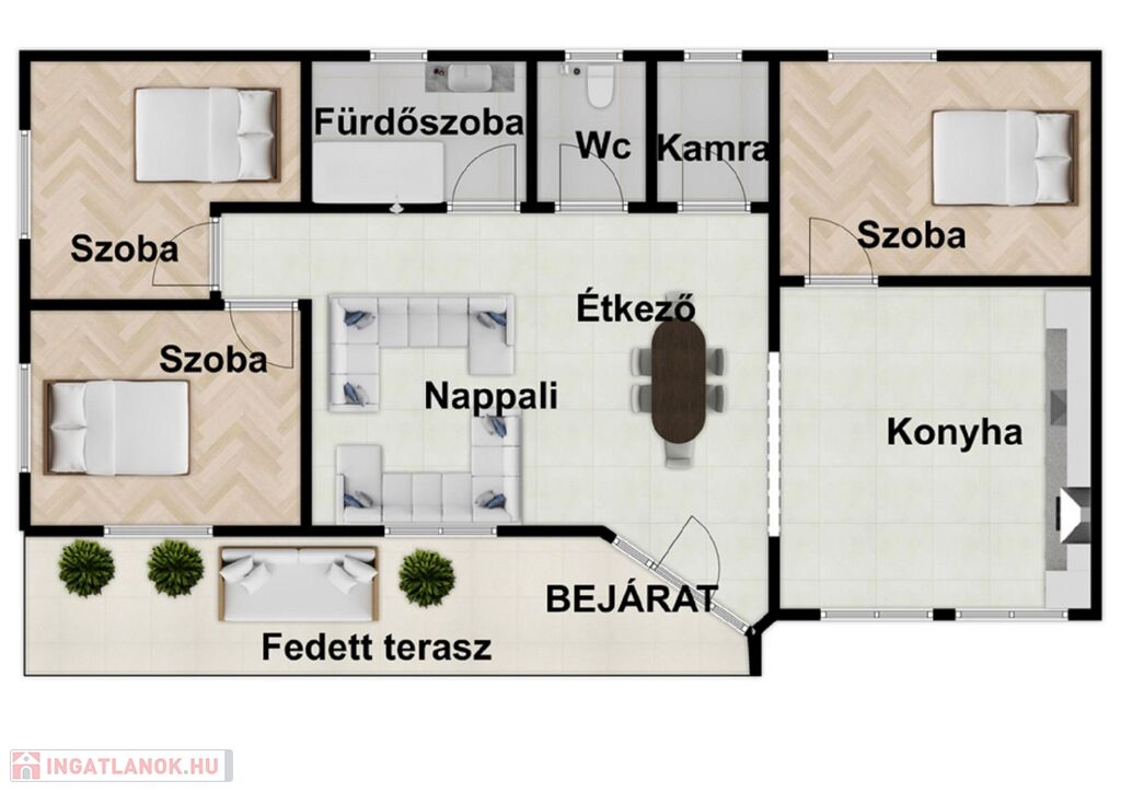 -120nm-es családi ház(amerikai konyhás nappali, 3 szoba, előszoba, fürdőszoba, kamra) mellett 15nm-es terasz