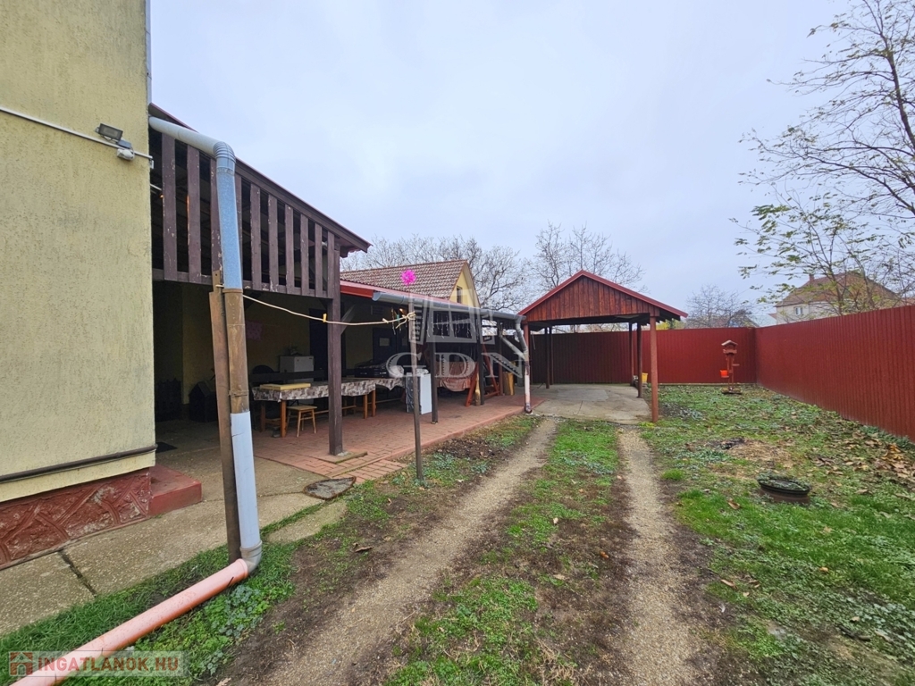Az ingatlan minden oldalról körbe van kerítve. A főépület előtt lehetőség van virágok, díszfák, vagy konyhakert kialakítására. Az épület mögött elhelyezkedő garázshoz és autó beállóhoz gépkocsi beálló út vezet, melynek eredményeként akár 4-5 autónak is van hely.