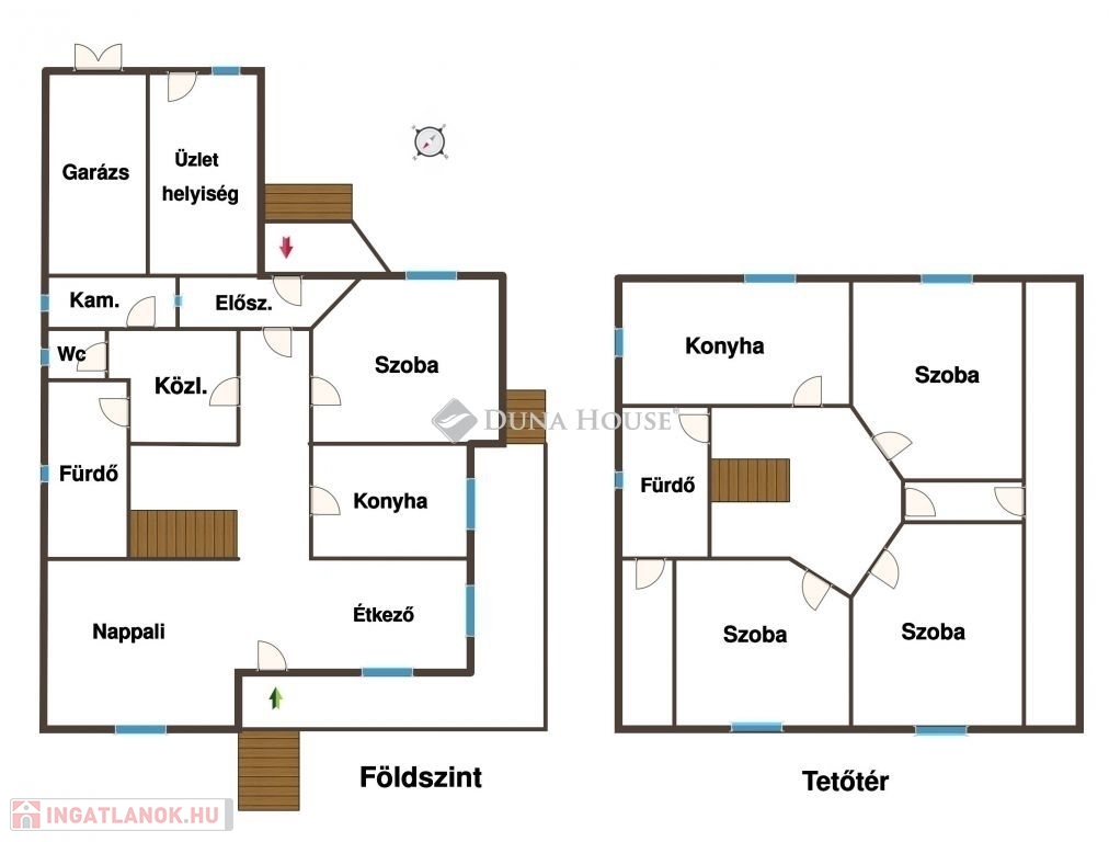 Kialakításra került a földszinten egy hálószoba, amerikai konyhás nappali, melyből közvetlen kijárás van a fedett teraszra és a kertbe. A földszinten található még előszoba, kamra, közlekedő, fürdőszoba, külön wc és egy lépcsőtér, melyen a tetőtérbe jutunk, ahol 3 hálószoba, fürdőszoba-wc, tárolók és egy konyha is található.