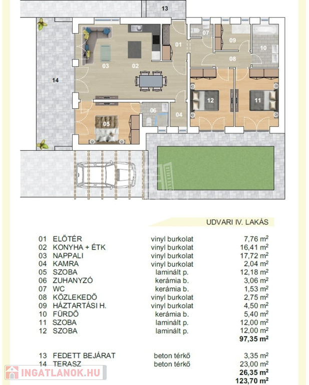 Burkolatok: Vinyl és laminált padlók, kopásálló hidegburkolat, burkolati keret: 5.000 Ft/m²-ig választható