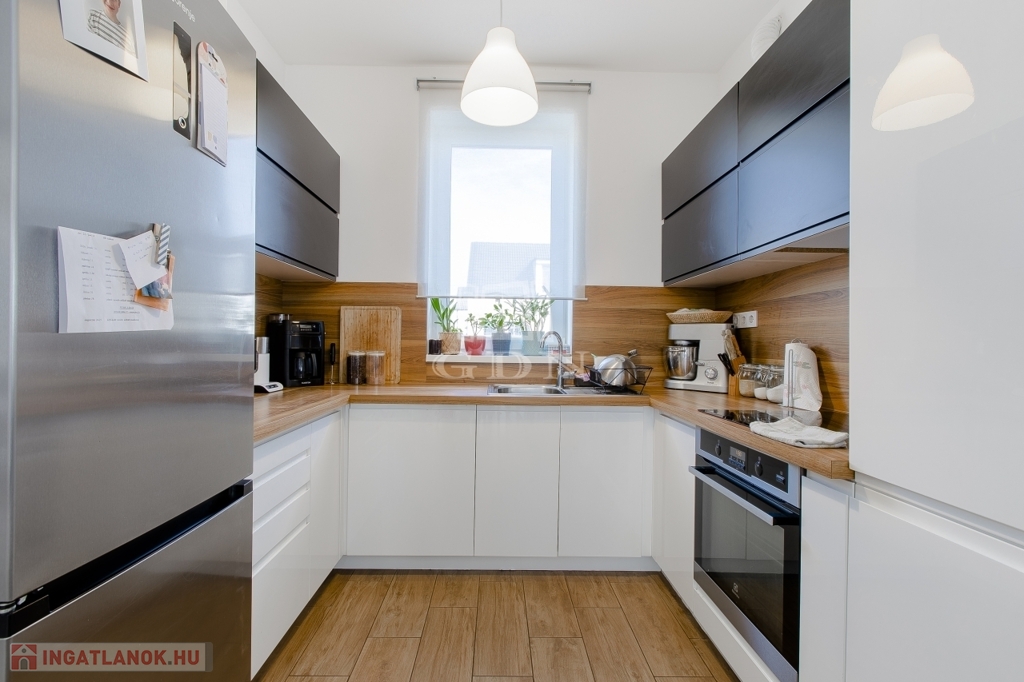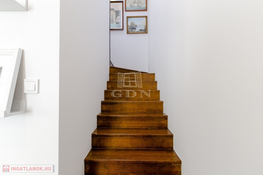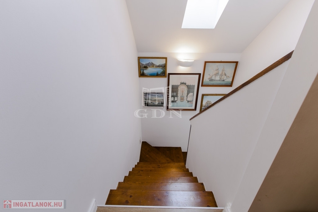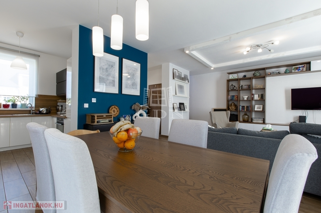 A földszinten található egy gépészeti helyiség, wc kézmosóval, kényelmes nagy nappali konyhával, közvetlen kertkapcsolattal.