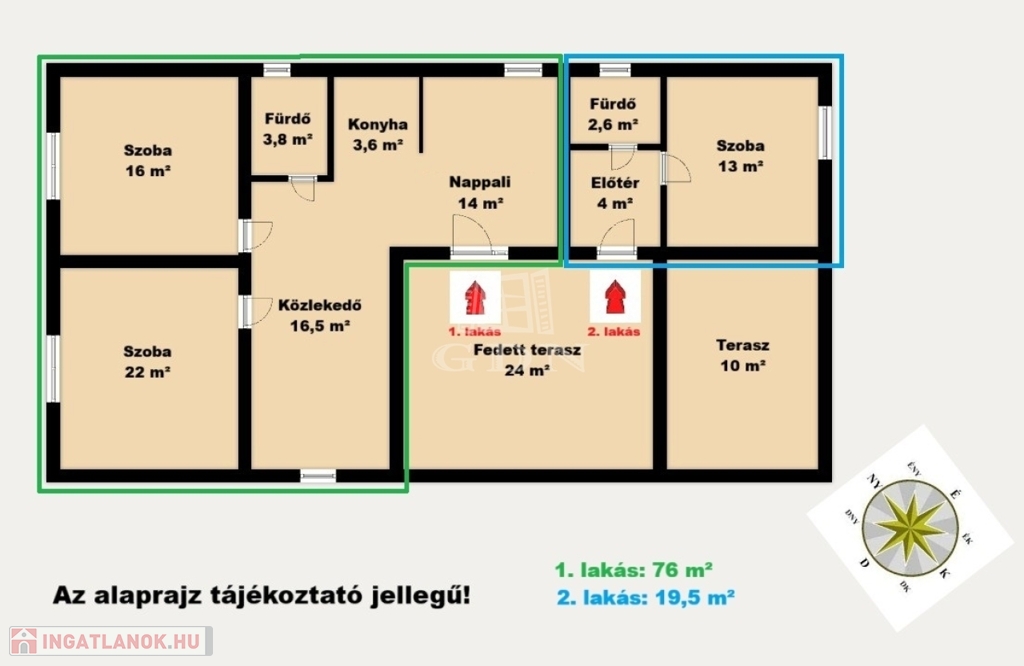 Az elrendezés PRAKTIKUS és RUGALMAS: az ingatlan két, egymástól elkülönülő egységre tagolódik. Egy külön, 19,6 m2-es ELSZEPARÁLT SZOBA saját FÜRDŐSZOBÁVAL rendelkezik, ennek fűtését INVERTERES KLÍMA adja. Emellett található egy 75,9 m2-es lakótér, amely 2 SZOBÁBÓL, NAPPALIBÓL, FÜRDŐSZOBÁBÓL, ELŐTÉR–ÉTKEZŐBŐL és KONYHÁBÓL áll. Ez a kialakítás sokféle használati módot támogat, és jól átlátható.