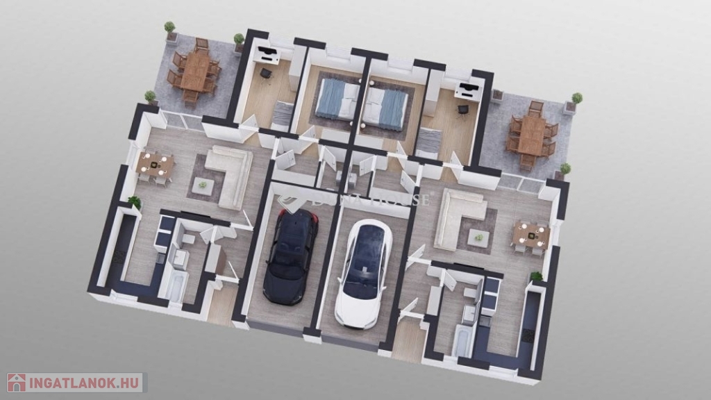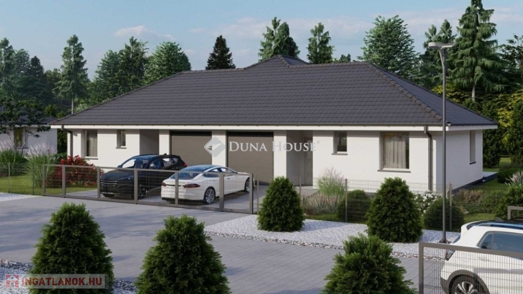 Kialakítása: 2 szoba, nappali, konyha, fürdő, külön wc, előtér, közlekedő, 19 m2 terasz, garázs.