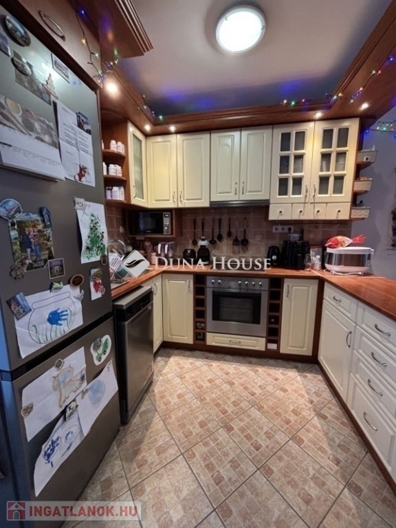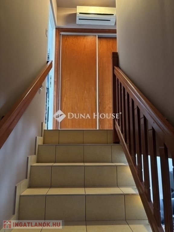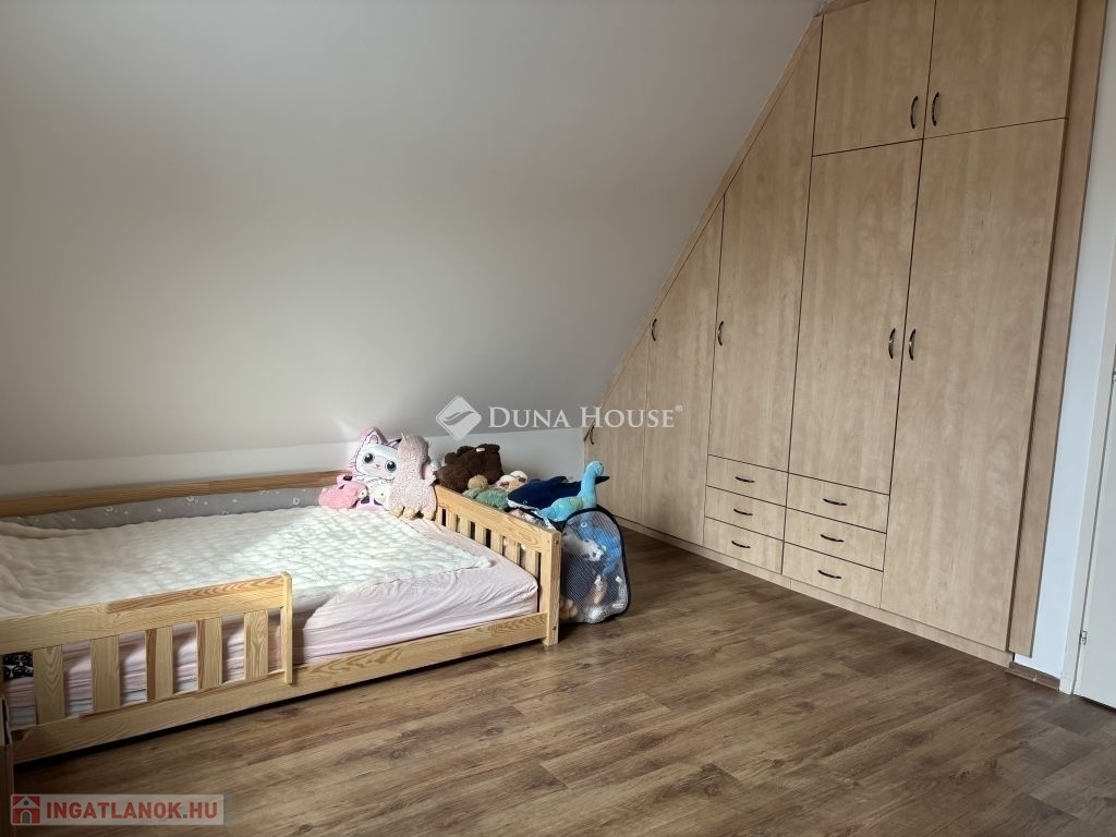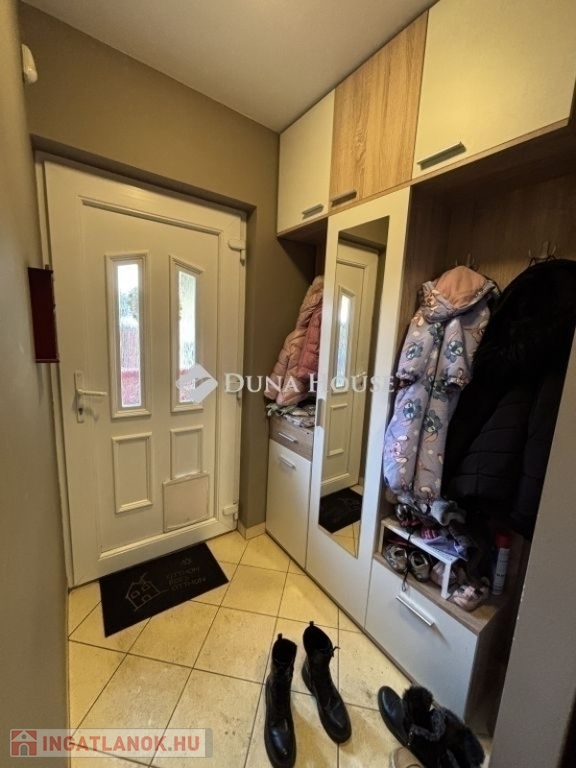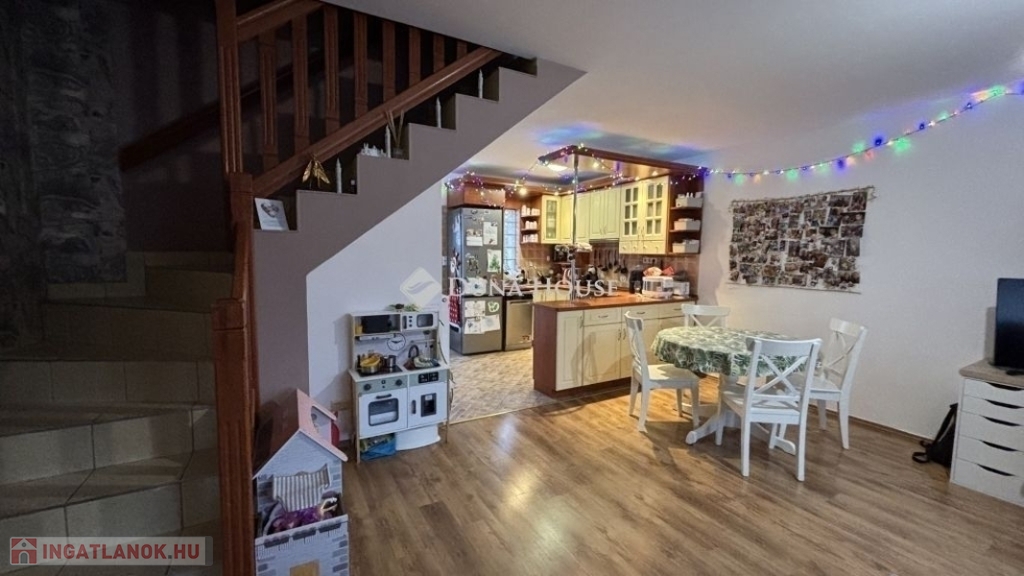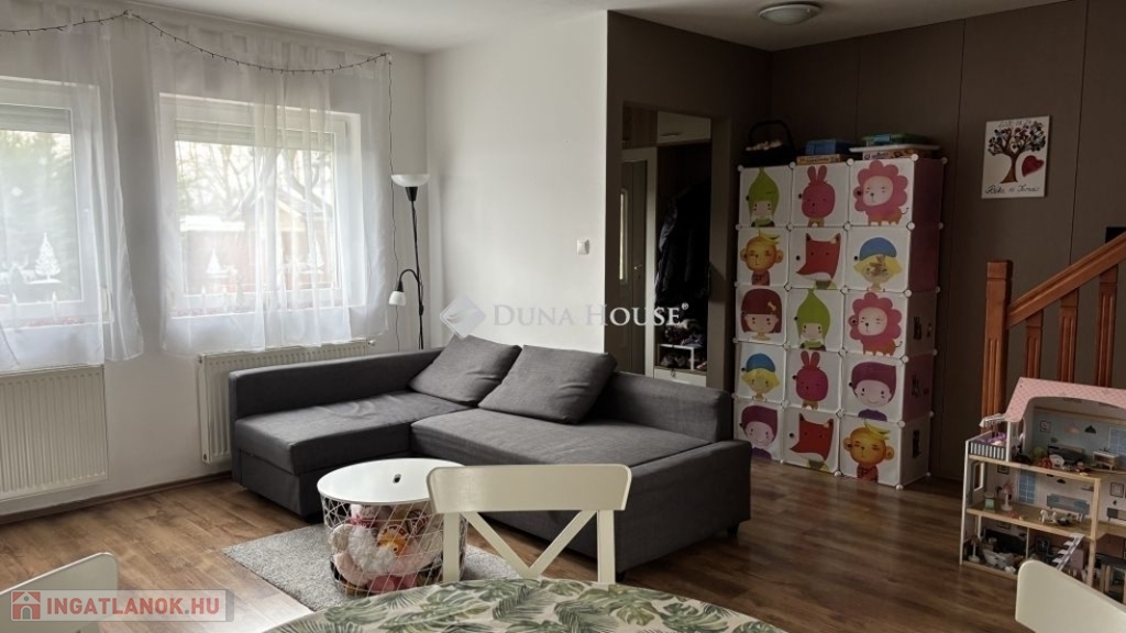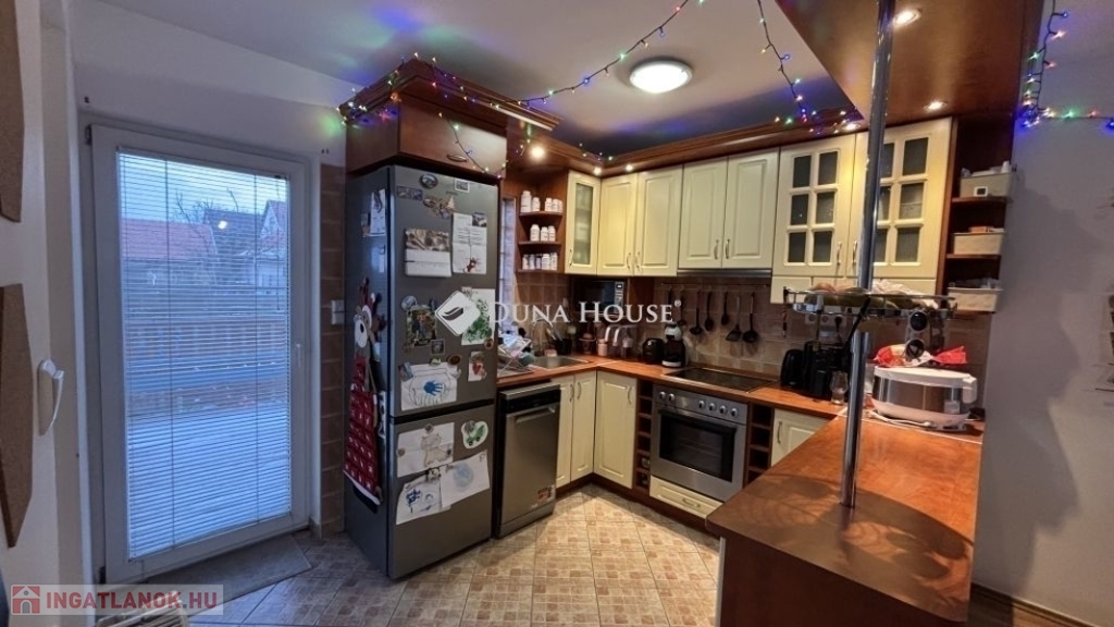 Eladó Pest-megyében, Üllőn, 294 nm-es, összközműves telken, egy 2006-os építésű, 64 nm-es, nappali + 2 szobás, tetőtér beépítéses Ikerház fél.Az épület 2006-ban épült, beton alapra, tégla falazattal, beton födémmel, cseréppel fedett tetővel. A falazatra egységes, 10 cm-es dryvitos hőszigetelés került. A nyílászárók hőszigetelt üvegezésű, műanyag szerkezetek, redőnnyel és szúnyoghálóval szerelve.A lakás földszinti részén szélfogó, előszoba, nappali, konyha, fürdő, a tetőtérben közlekedő és két háló található. A hátsó kert kívülről és a konyhából nyíló ajtón keresztül a teraszon át is megközelíthető.A nappali és a szobák laminált parkettával, a többi helyiség és az emeletre felvezető beton lépcső is, járólappal fedett.A konyhabútor a gépészettel, és az elszívóval együtt a vételár részét képezi.A fűtésről és a használati meleg víz-ellátásról kombi cirkó gondoskodik, a hőleadók lapradiátorok. A tetőtérben hűtő-fütő klíma berendezés emeli a komfortérzetet. Az ingatlan mozgásérzékelőkkel, riasztóval szerelt.A 845 nm-es önálló telken 3 önálló egységet alkotó ingatlan található. Az eredeti épület egy régebbi építésű családi ház. A porta megosztásra került és 2006-ban, egymáshoz képesti eltolással két ikerház épült, melyből most az egyik eladó.Az eladásra kínált ingatlan természetben is és jogilag is teljesen független a többitől. Az iker szomszéddal közös falra 7,5 cm vastagságú Halltex hangszigetelő rendszer került.Saját használatú, lekerített, 294 nm-es kerttel rendelkezik. A telek növényekkel beültetett, melyben fúrt kút és automata öntözőberendezés szolgálja a tulajdonosok kényemét. A kertben elől két autó számára kialakított fedett kocsibeálló, és a kerti szerszámok tárolására alkalmas kis tároló található.A gépkocsibeálló kamerával megfigyelt, valamint az elektromos kapu elő lett készítve.A beépített bútőrok a vételár részét képezik!