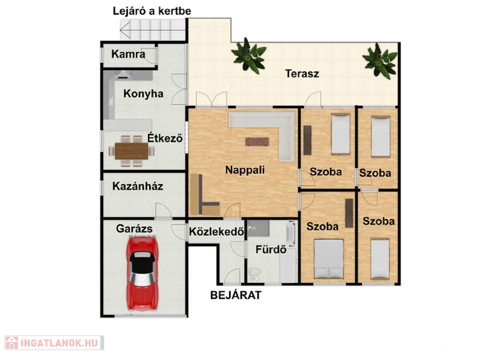 A földszinten helyezkedik el a lakrész a garázzsal, kazánházzal és egy 42nm-es, napfényes terasszal.