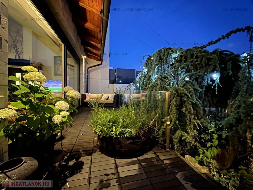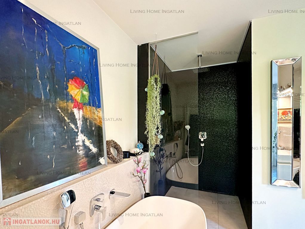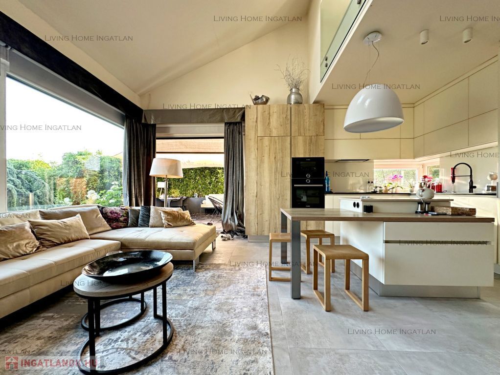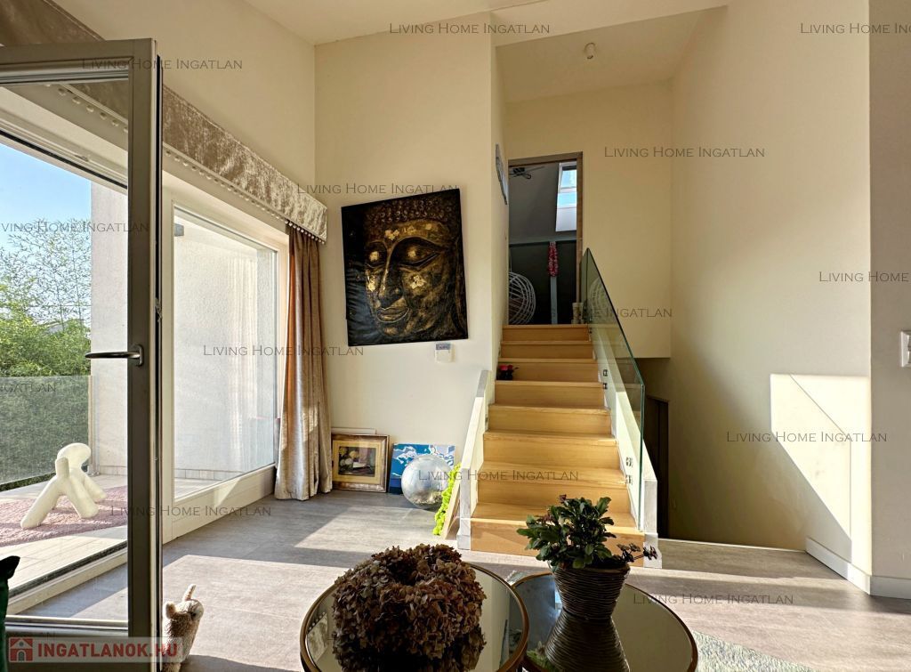 For sale a modern semi-detached house at the meeting point of the Pilis and the Buda Hills, in Üröm, on Rókahegy. The 440 sqm intimate garden with Mediterranean and other ornamental plants, rock garden, relaxing corner and large terrace complete the tranquility and recharging of this home.