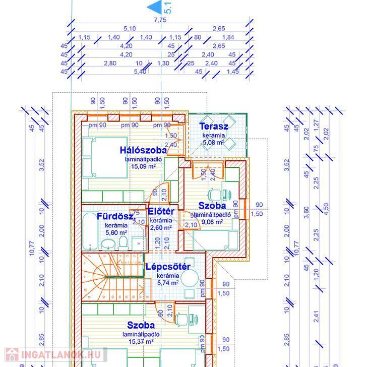 Emelet: kádas-zuhanyzós fürdőszoba+WC, 3 hálószoba (kettő saját közös terasszal), közlekedő.