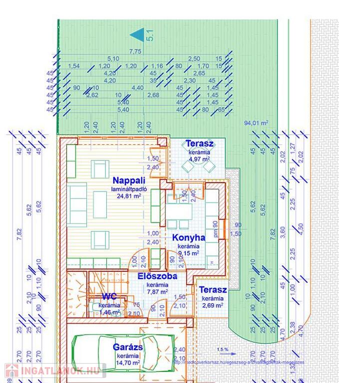 Földszint: előszoba, garázs, WC, kamra, konyha-étkező-nappali kertkapcsolattal.