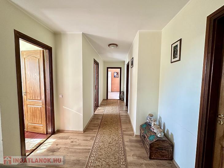 A nagyobbik lakrész alsó szintjén egy világos, amerikai konyhás nappali, étkező, közlekedő, teraszkapcsolat, pincelejáró és külön WC található. Az emeletre felérve egy közlekedő, egy fürdőszoba és három külön nyíló hálószoba kapott helyet, melyek közül az egyikhez praktikus gardrób is tartozik.