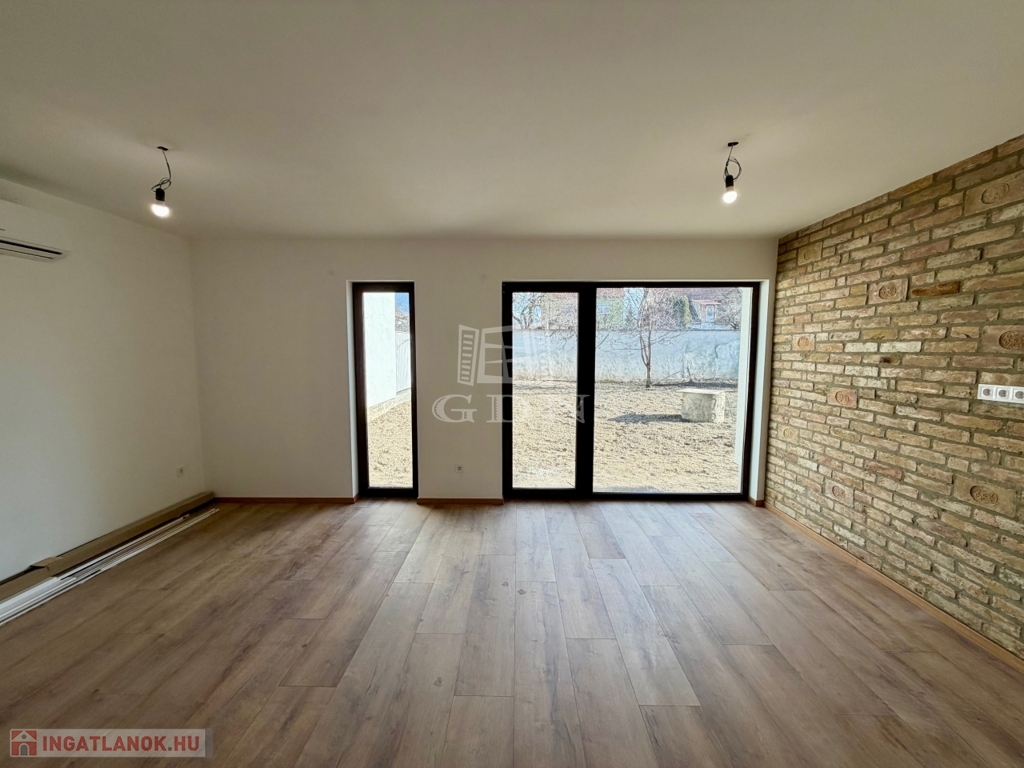 Az alsó szinten egy tágas, napfényes amerikai konyhás nappali kapott helyet, közvetlen kijárattal a kb. 90 m²-es saját kertbe, valamint egy vendégmosdó és egy tároló.