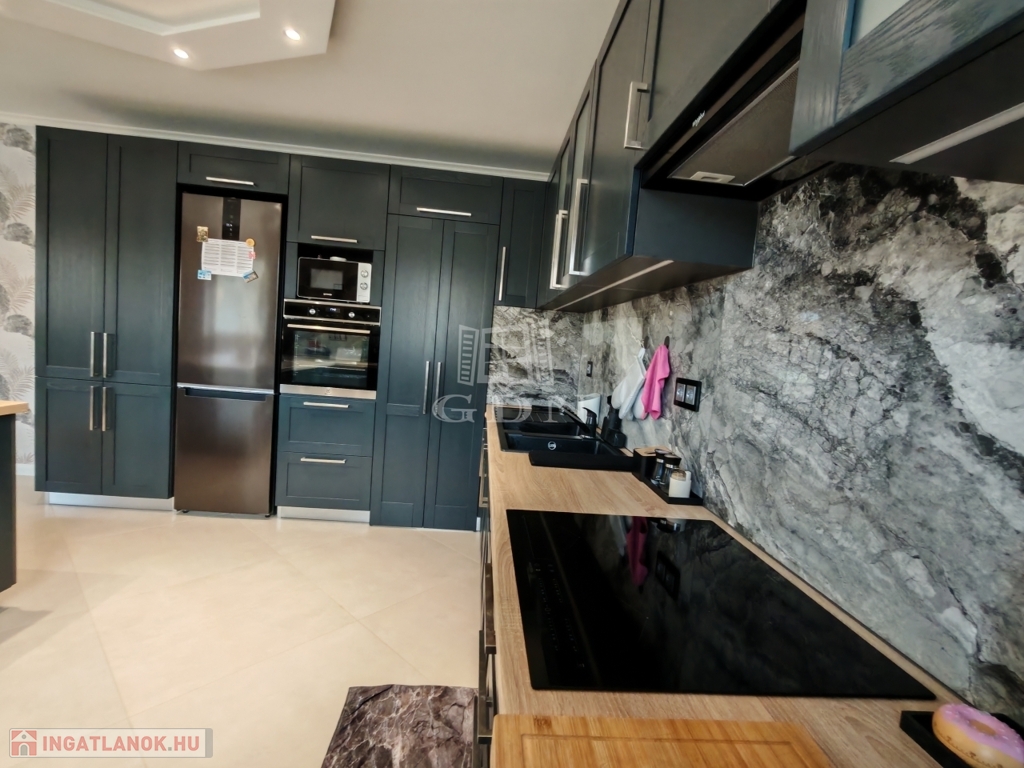 Modern, nagyméretű, világos konyha, mely tökéletes helyszíne a közös étkezéseknek és családi pillanatoknak