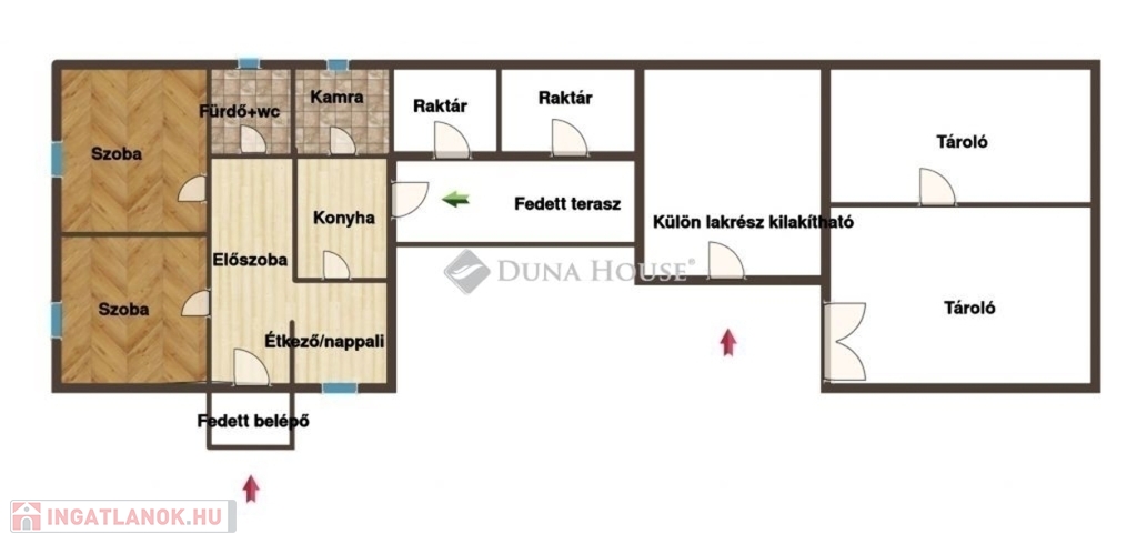 Kialakítása: 2 tágas utcafronti szoba, közlekedő, étkező, konyha, fürdő+wc, kamra, tágas fedett terasz. További raktár és műhely az udvaron, tároló és gépkocsibálló.