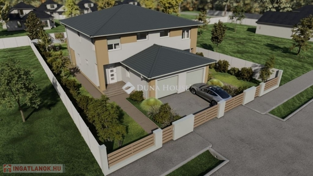 Eladó Vecsés Felsőhalmon egy 147 nm alapterületű, nappali+ három halószobás, belső kétszintes, 424nm-es saját kerttel, garázzsal, hőszivattyús fűtéssel rendelkező, újépítésű ikerház egyik fele.