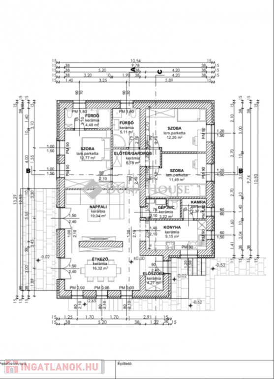 - Előszoba, nappali + étkező + 3 szoba, konyha, kamra, 2 fürdő, 3 WC, gépészeti helyiség