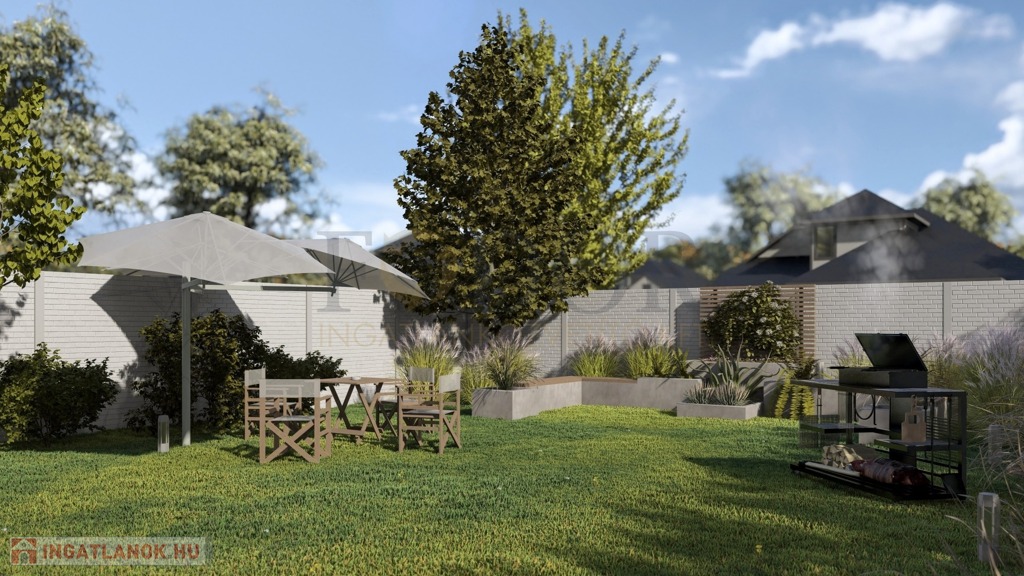 A 849 m²-es telken épülő ingatlan mindkét fele saját, 424 m²-es leválasztott telekrésszel rendelkezik, valamint egy viacolorral burkolt kocsibeállóval is ellátott.